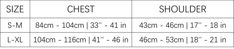 L-XL | 104cm - 116cm | 41'' - 46 in | 46cm - 53cm | 18'' - 21 in |
